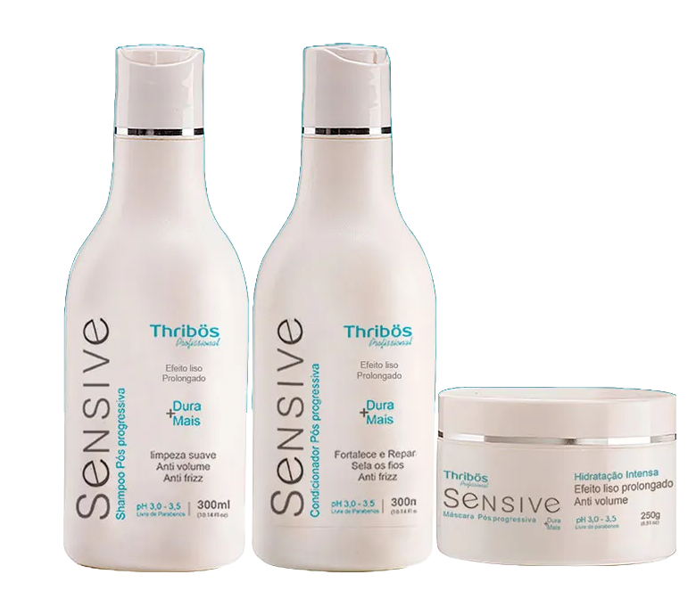 Sensive pós progressiva é uma linha de manutenção especialmente desenvolvida para atender pessoas com cabelos alisados por progressiva ou botox. Os benefícios de Sensive incluem hidratação intensa dentro e fora do fio, efeito liso prolongado, redução do frizz, ação antivolume e a selagem da cutícula capilar que preserva a nutrição do fio e impede penetração de umidade após o uso.